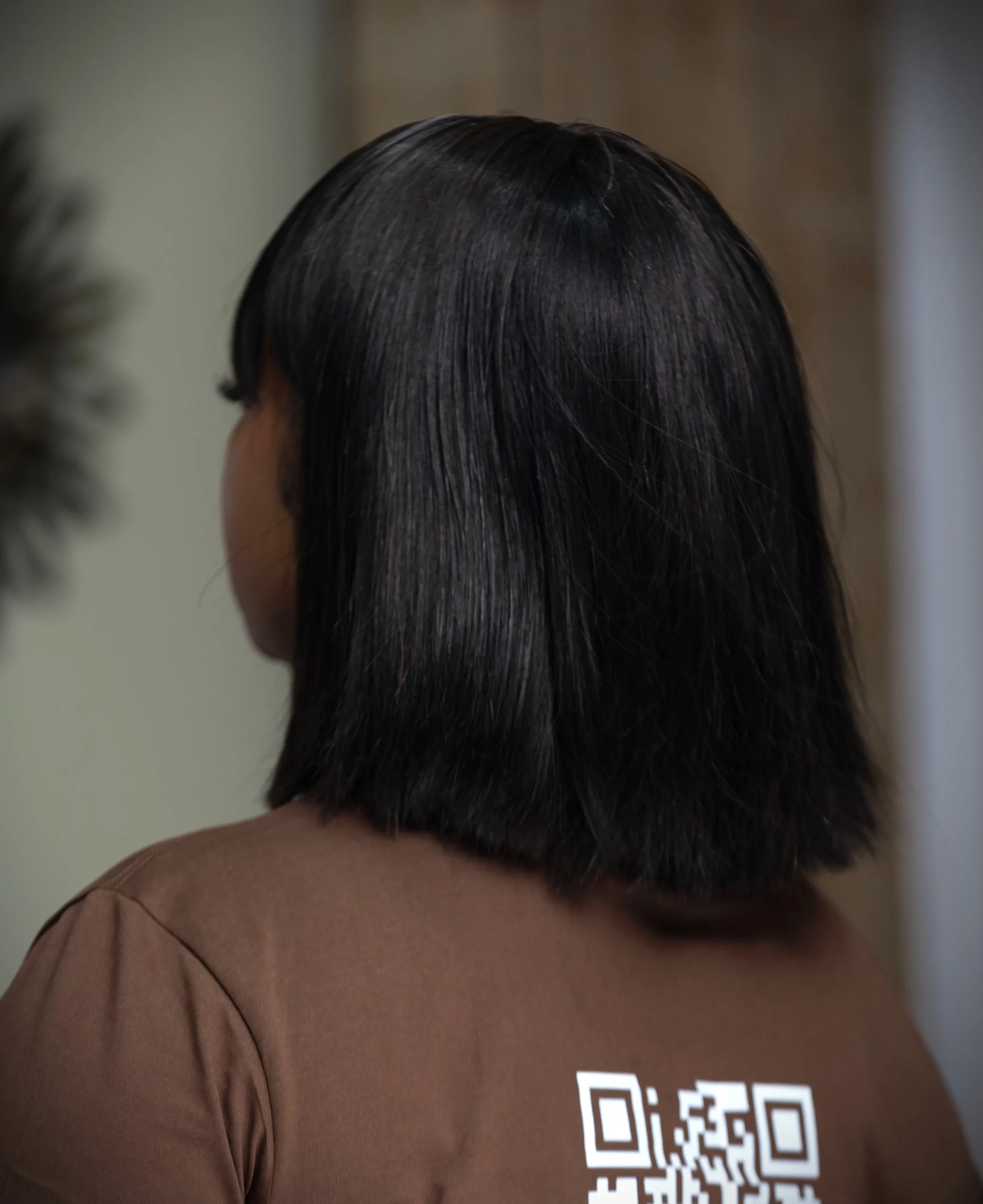 10-inch SDD (Super Double Drawn) bone straight fringe wigs is a premium, 100% human hair bob-style wig featuring an ultra-sleek, pin-straight texture with no waves, typically in a natural black shade.